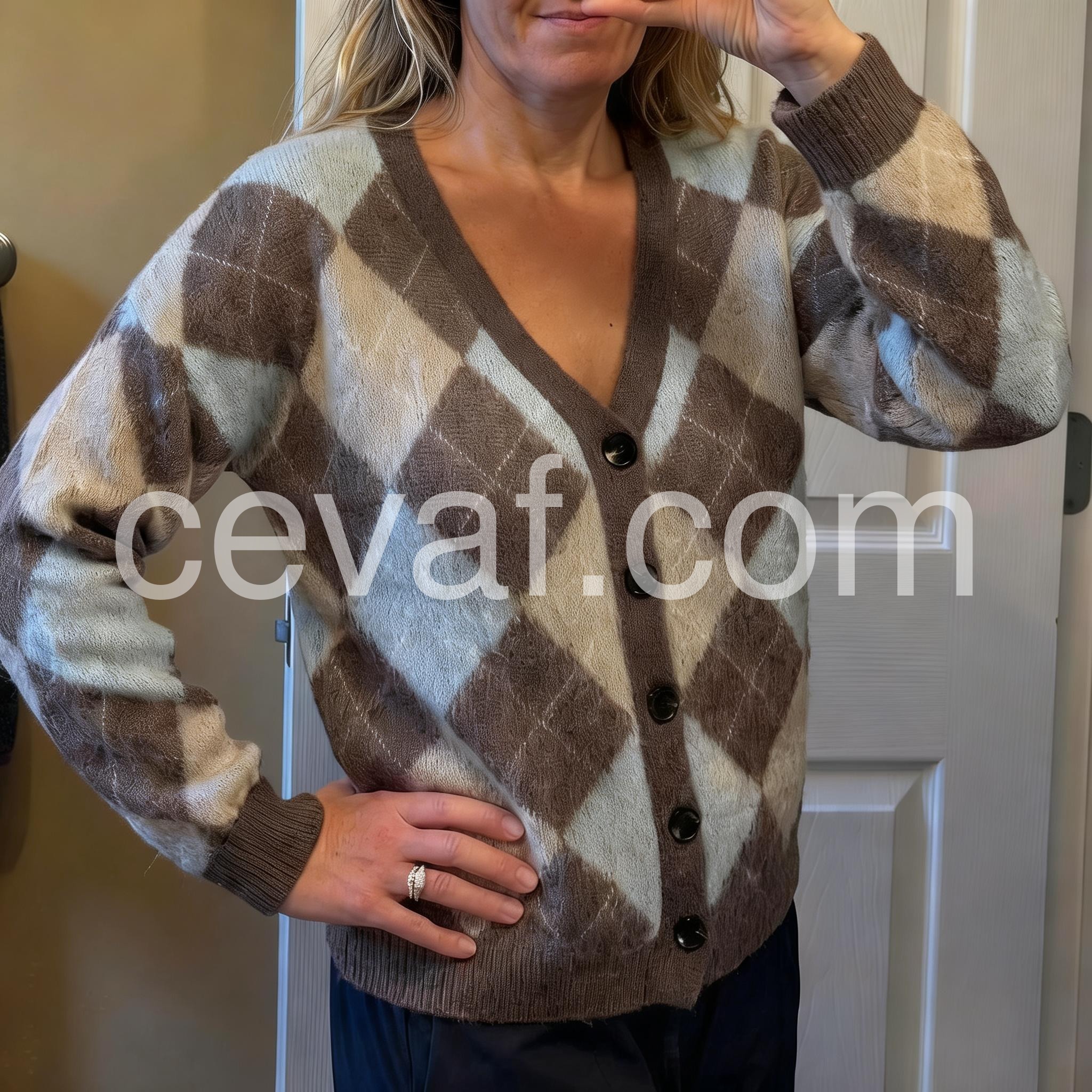 Argyle Geometric Print Cardigan With Button Front In Neutral Tones