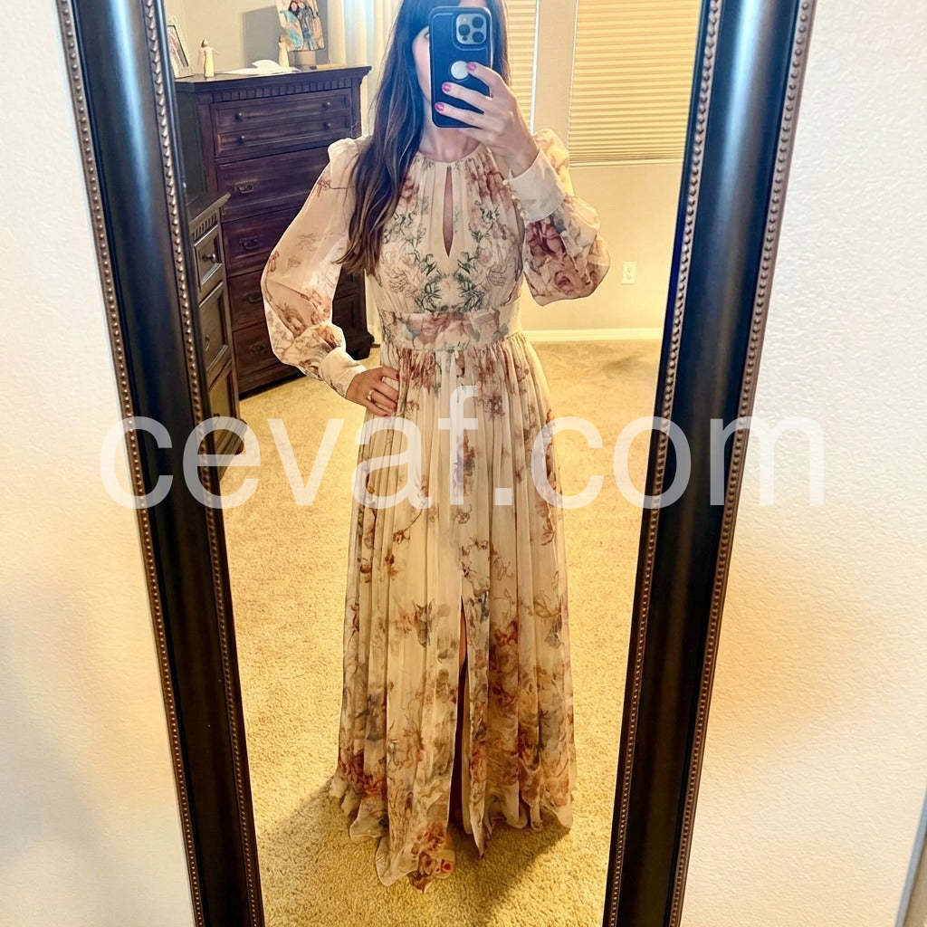 Crafted from lightweight chiffon, this vintage-inspired maxi dress features an elegant floral print that captures timeless sophistication. The flowing silhouette and long sleeves provide graceful coverage while maintaining breathable comfort, making it ideal for both casual outings and special occasions. The maxi length creates an elongated, flattering line that works across various body types. Perfect for layering or wearing solo, this piece seamlessly transitions from day to evening wear with its versatile design and classic aesthetic.